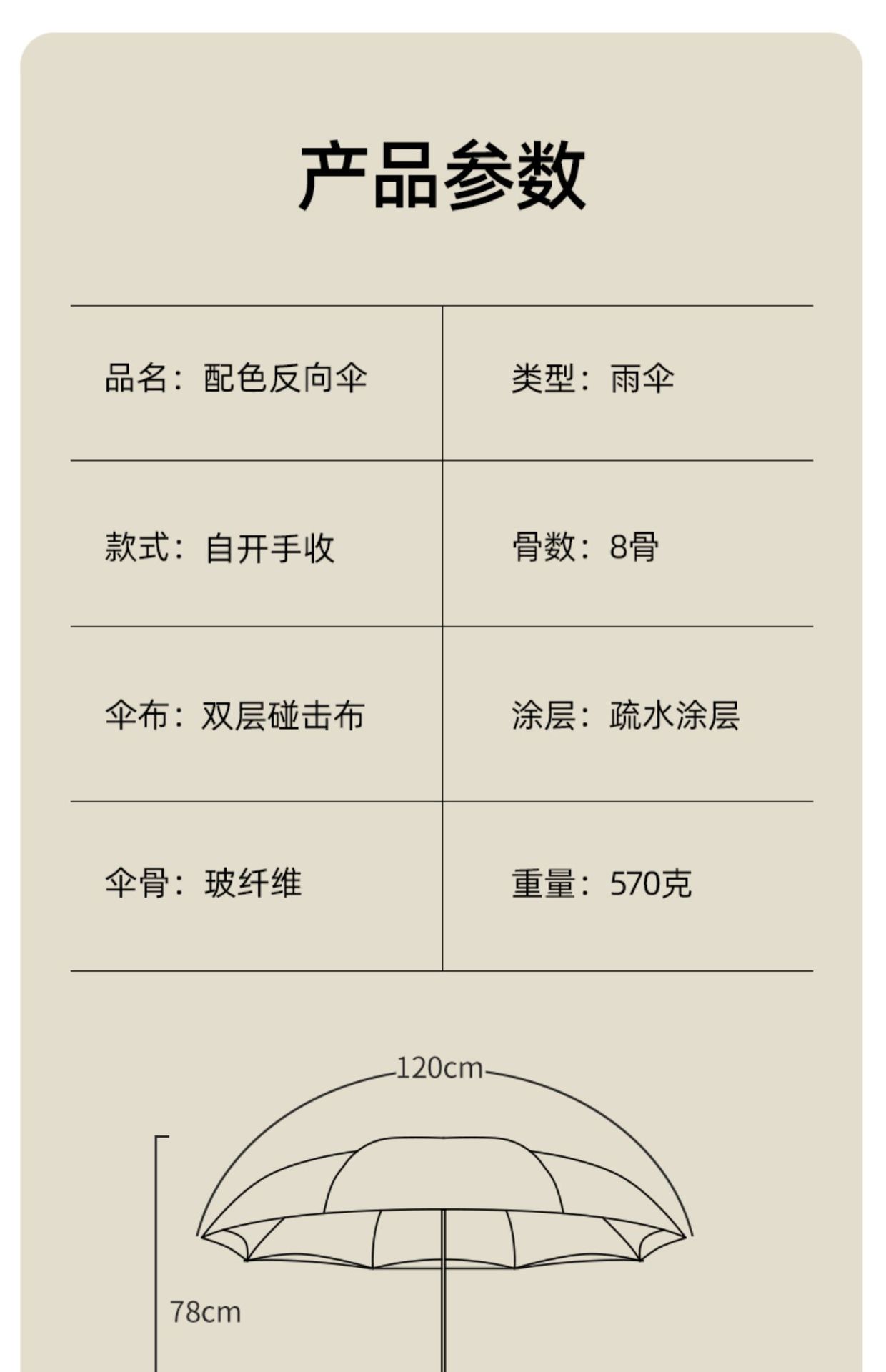 【骨架】:23寸x8k自動開鐵中棒纖維骨反向傘
